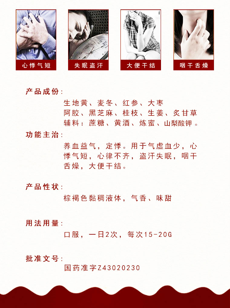养血益气,用于气虚血少,心悸气短,心律不齐,盗汗失眠,咽干舌燥,大便干结